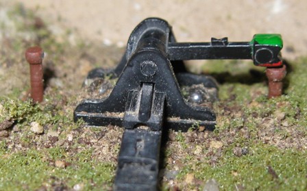 Next, a number of 3/4 inch brads were painted Rusty Red Primer and when dry, put into place at Fort Ann. I left about 1/4 inch above ground, and the brad then acts as a stop for the handle. To me, at least, it seems to make it a lot easier to access the handle without having to dig around in the ground cover for it.