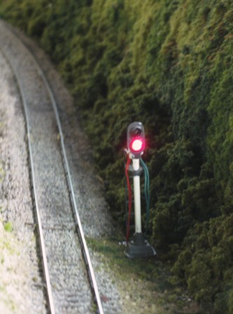 Briefly, I needed three two-color signals to wire into the circuit. Normally, the signal light would be green. However, if the Dividing Creek yard area suffered a short circuit, the relay would trip and the signal would go red. Hopefully, then train crews would know enough not to pass the red signal. Once the short is cleared, the signal returns to green. Fortunately, I did have four very old Walthers two-color signals to use at these spots. The accompanying photos show the new installations.